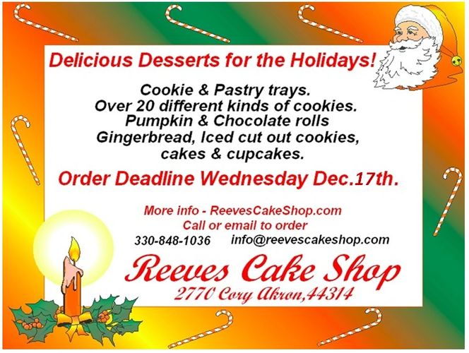 Available November 30th thru December 17th. Call for more information 330-848-1036