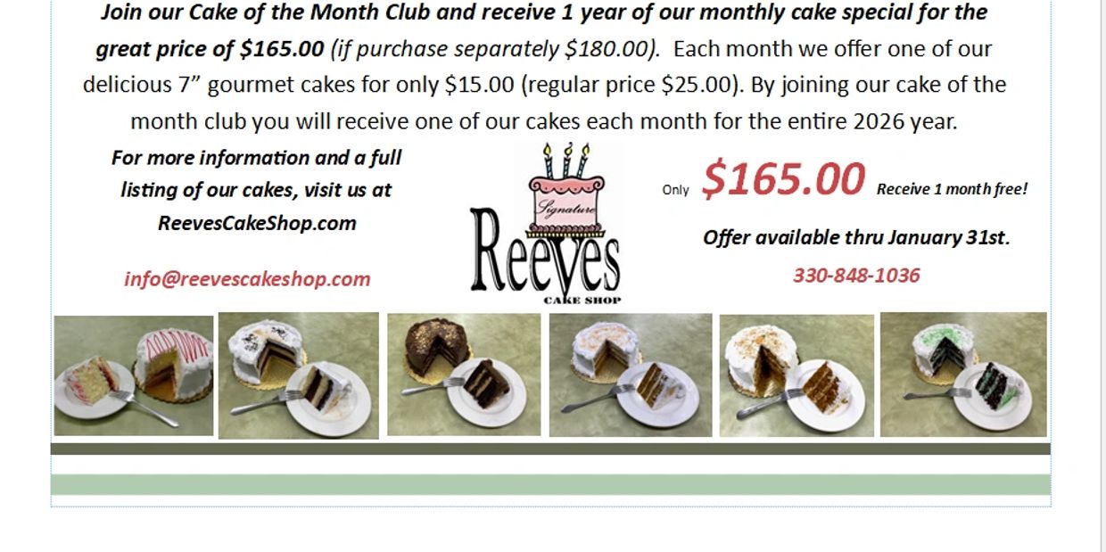 Reeves Cake Shop bakes all desserts to order. We have been doing it this way for 49 years. Our customers enjoy our fresh baked cakes and cookies because they are baked for them. Generally 1-2 day notice is required. For Saturday pick up we need the order placed by closing on Thursday. For more elaborate designs a minimum of 1 week notice is required. Questions and orders can be placed by stopping in our bakery, calling or emailing. We are closed on Sundays and Mondays.
